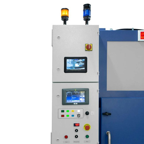 Органы управления манипулятором и параметрами работы излучателя расположены на боковой консоли. Обработка информации о параметрах работы системы происходит с помощью промышленного компьютера и отображается на рабочем мониторе оператора. Система лазерного целеуказателя смонтирована на бленду рентгеновского излучателя и обеспечивает обозначение контура телесного угла рентгеновского излучения. Встроенная система видеонаблюдения позволяет отслеживать процессы, происходящие в защитной камере в режиме реального времени. Два рентгенозащитных лабиринта в виде распашных дверей на боковой стенке камеры предназначены для быстрой и удобной прокладки кабелей связи и питания испытуемой аппаратуры.